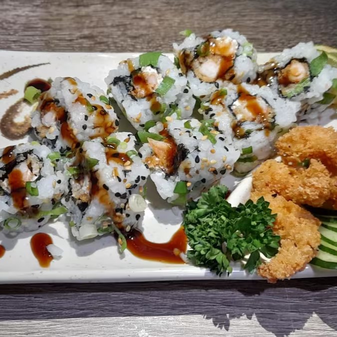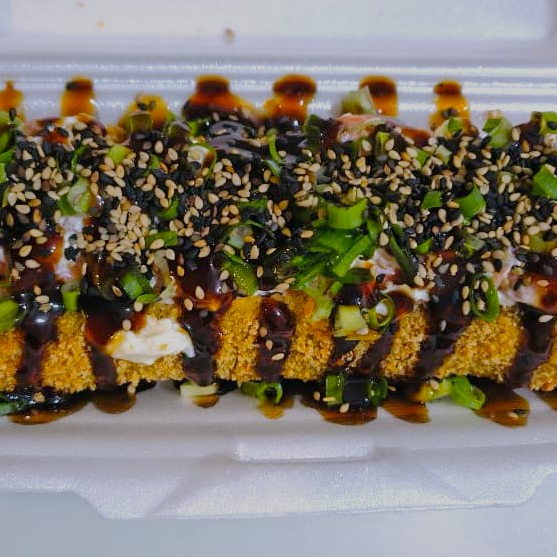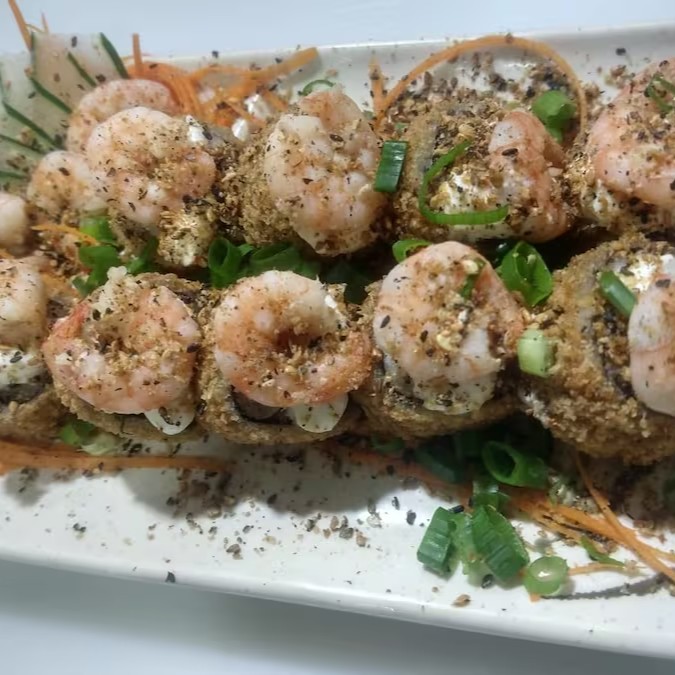 Arroz, Alga, gergilhim, cebolinha, cream cheese e camarão empanado