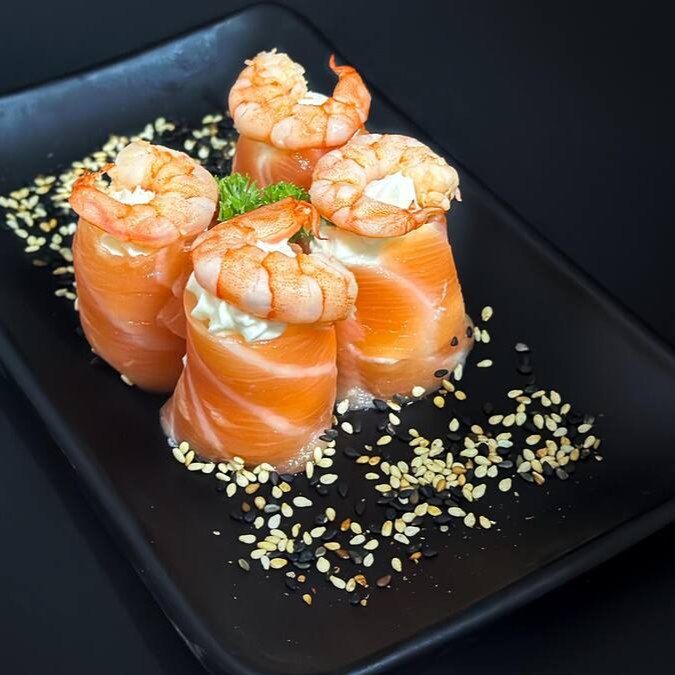 Salmão enrolado com cream cheese e camarão maçaricado