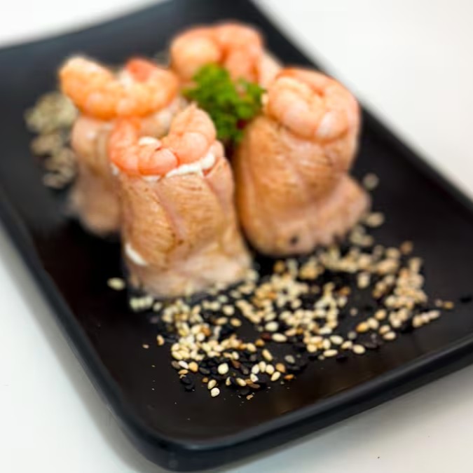 Salmão enrolado com cream cheese e camarão