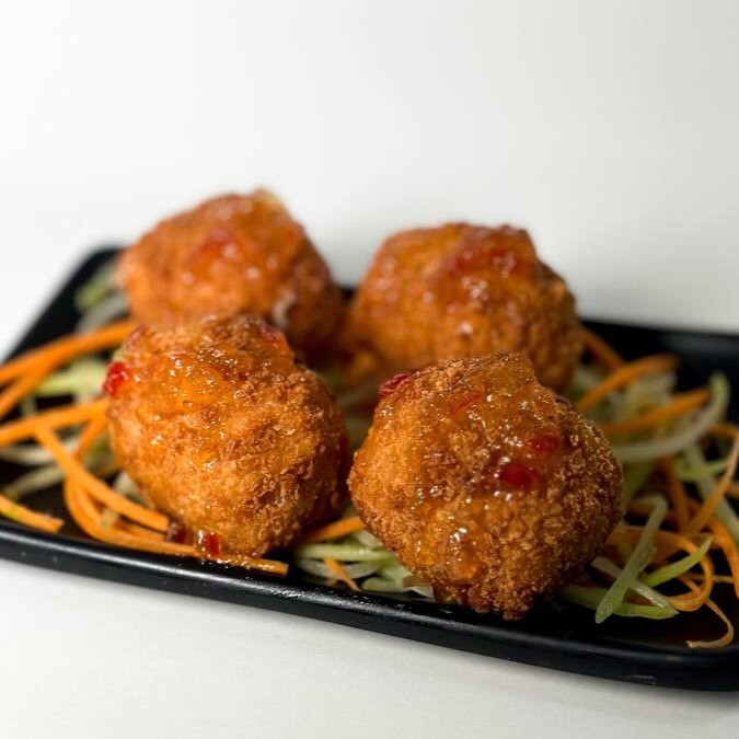 Salmão, cream cheese, cebolinha, empanado em farinha panko e geleia de pimenta.