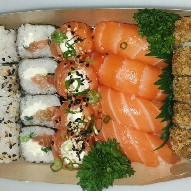 4 sashimi, 4 sushi salmão, 4 sushi salmão selado, 4 joe simples, 4 huramaki Filadélfia, 8 hossomaki Filadélfia.