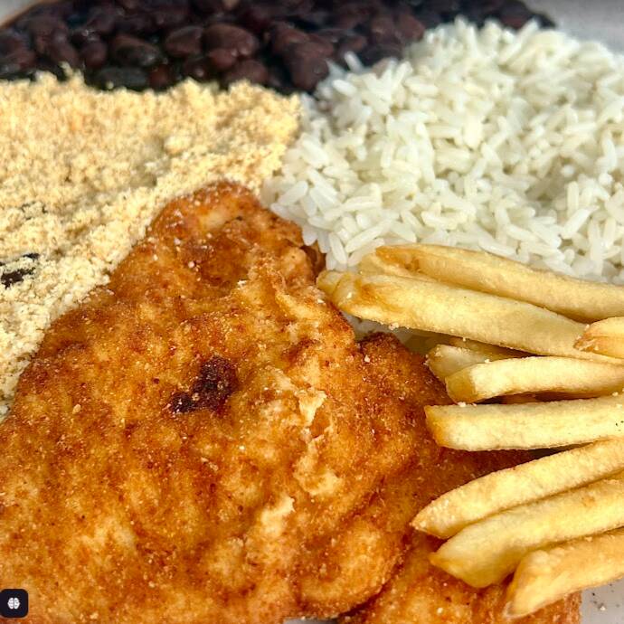 Frango empanado crocante por fora e macio por dentro, arroz, feijão e guarnição. ✔️ Crocância que conquista no primeiro pedaço.