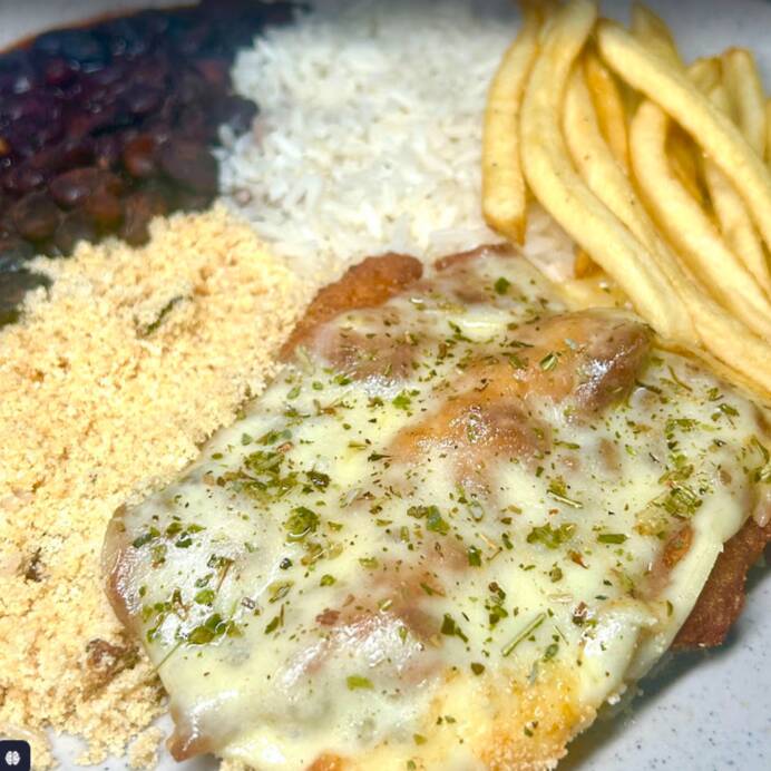 Filé de frango empanado, coberto com molho de tomate artesanal e muito queijo Xavecon Laticínios 🧀 Acompanha arroz, feijão e guarnição do dia.