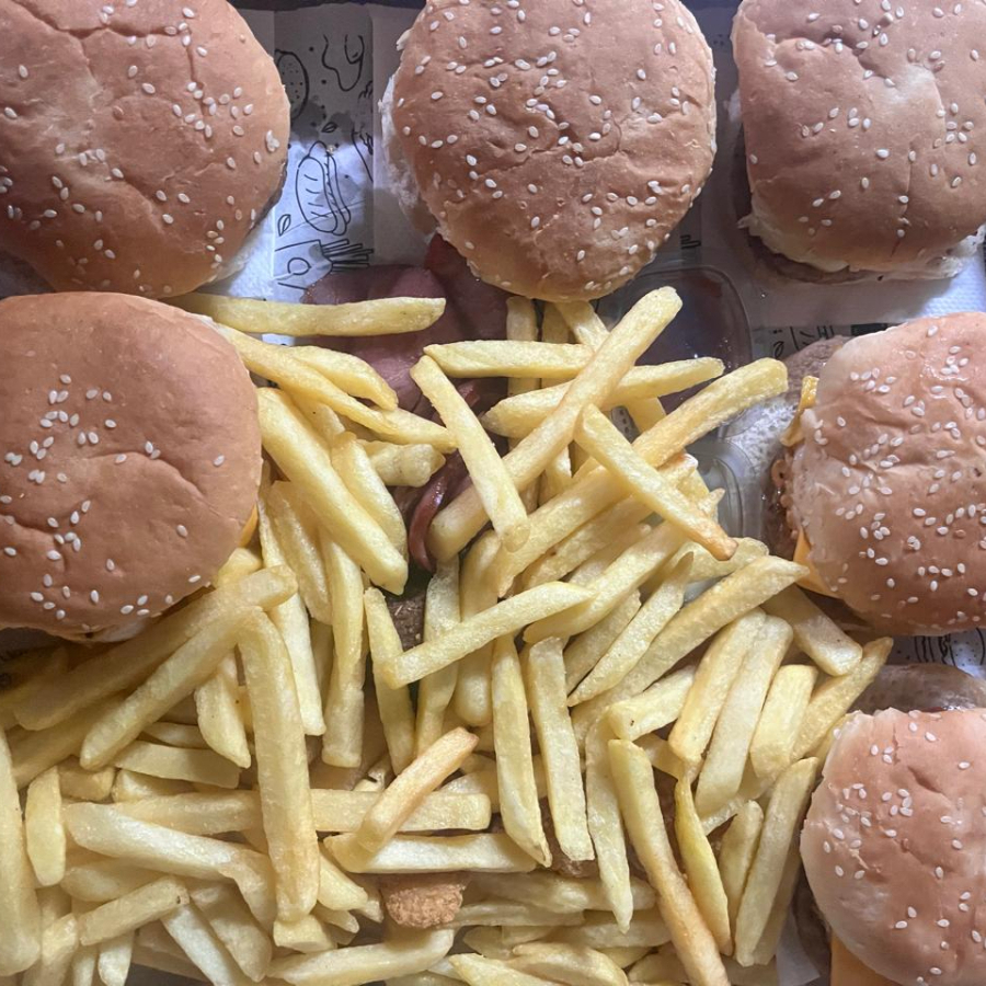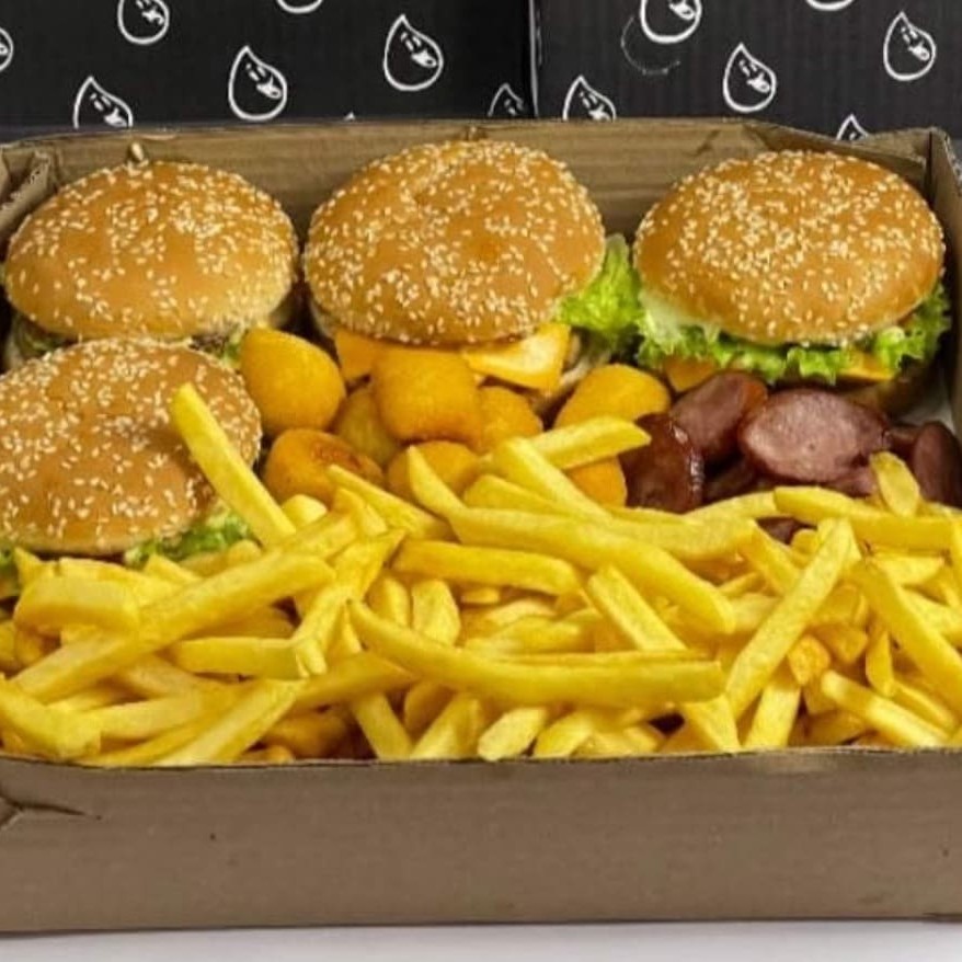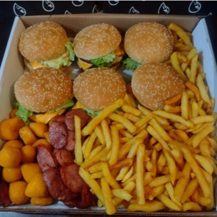 06 X BURGER + 500 GR DE BATATA + 10 SALGADOS OU NUGGETS + CALABRESA