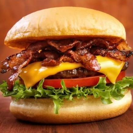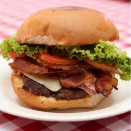 Foto meramente ilustrativa. Pão, carne, queijo, bacon e molhos.