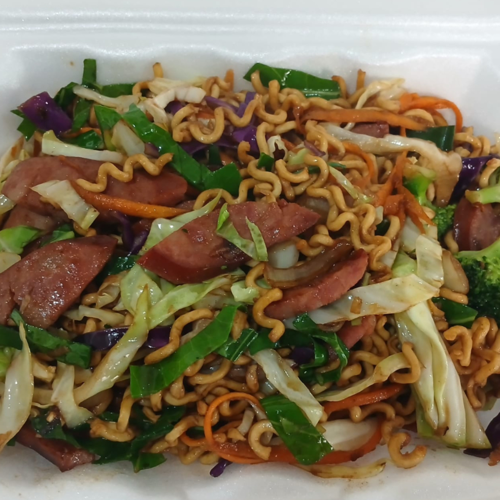 Macarrão oriental, calabresa, repolho roxo e verde, couve verde, brocólis, cenoura e gergelim.