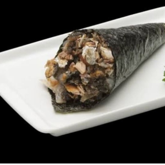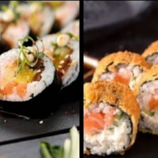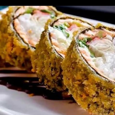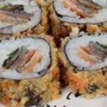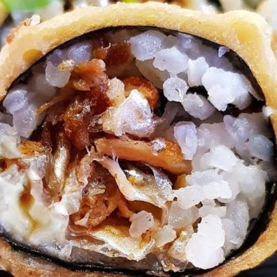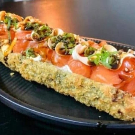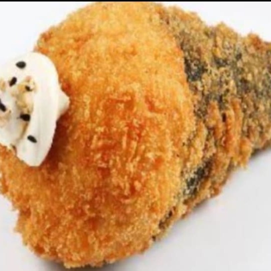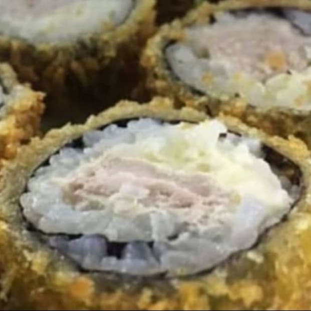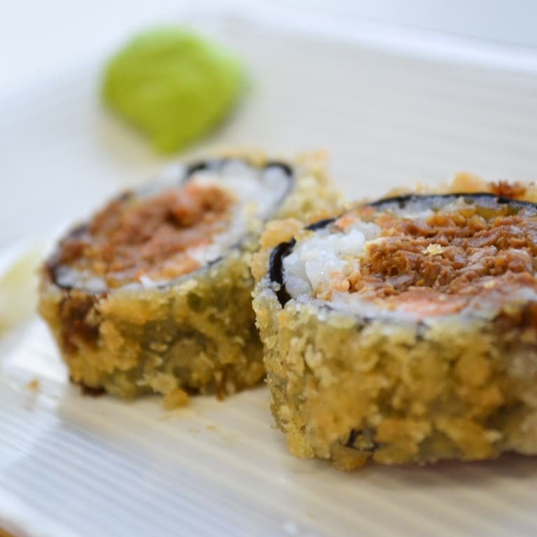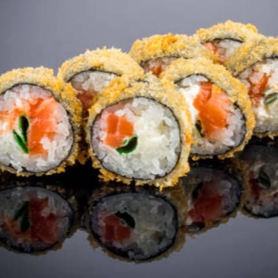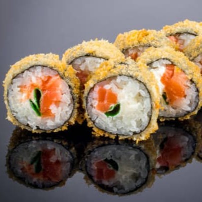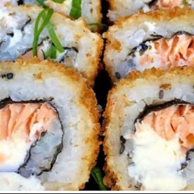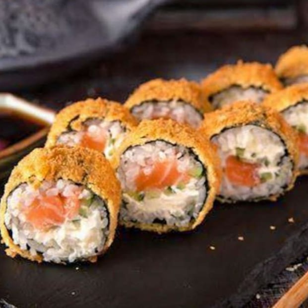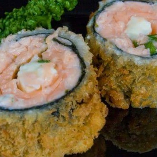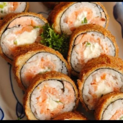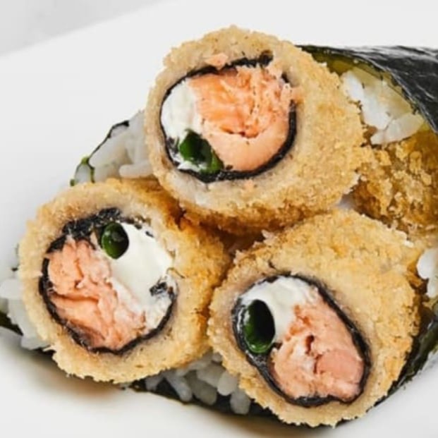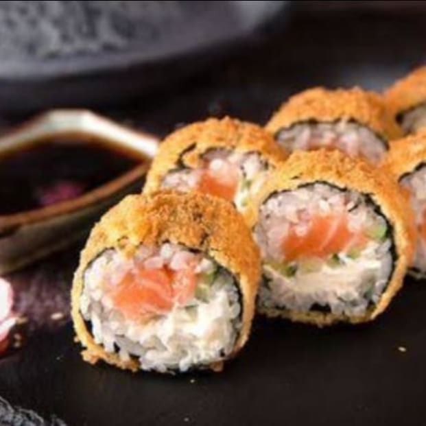 Arroz , nori , cream chesse , pele de salmão grelhado empanado na massa e farinha panko