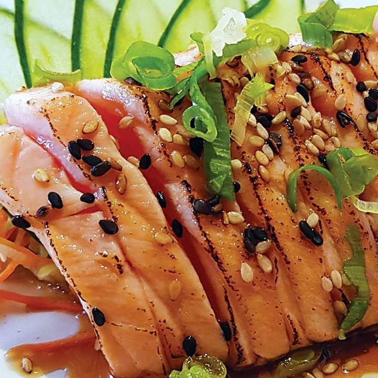 Uma lâmina de salmão com cream chesse , teriaki e gergelin