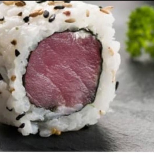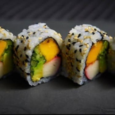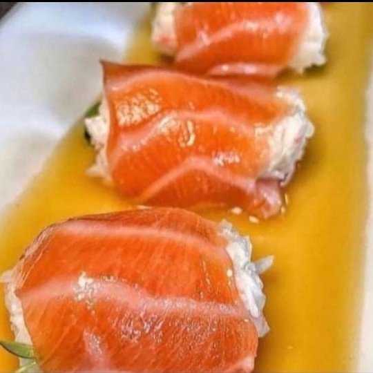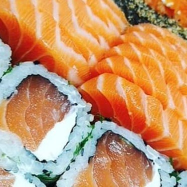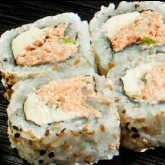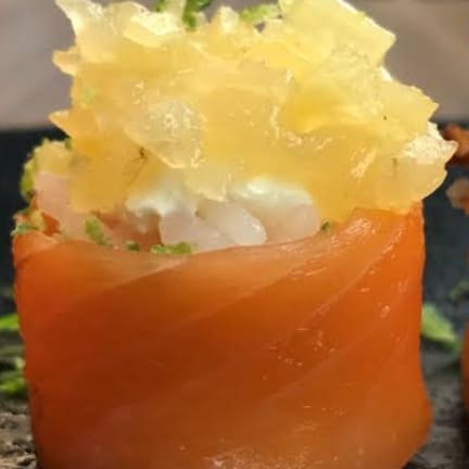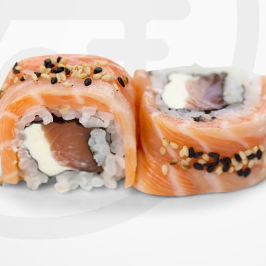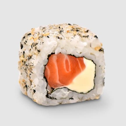 Enrolado de arroz e fatia de salmão e gergelim por fora. Recheio de salmão fresco e cream chesse.