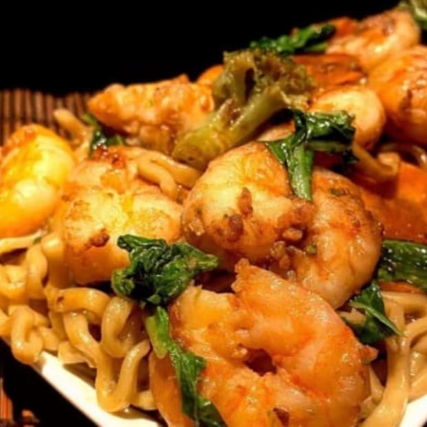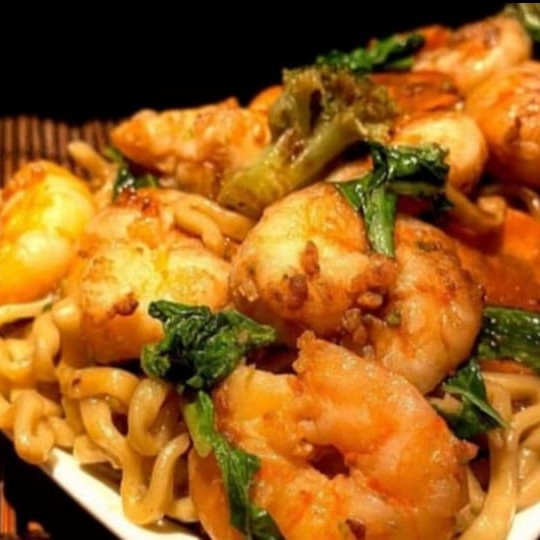 Camarão, macarrão,repolho verde , repolho roxo, cenoura e brócolis americano.