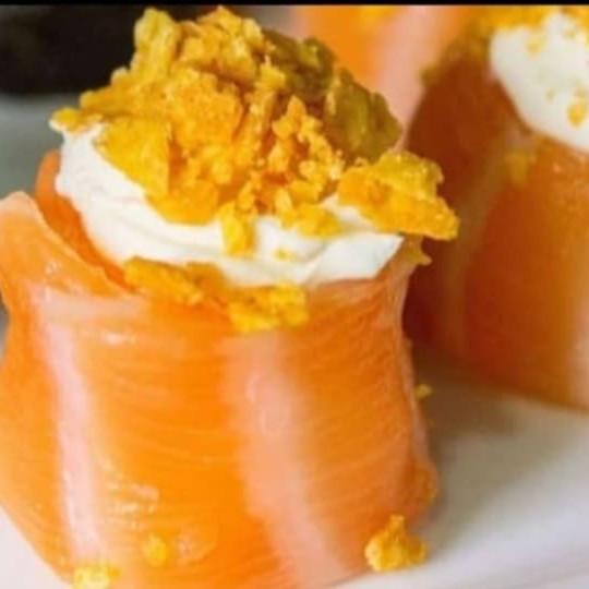 Arroz, cream chesse , lâmina de salmão , e tartar de salmão picadinho com cebolinha.
