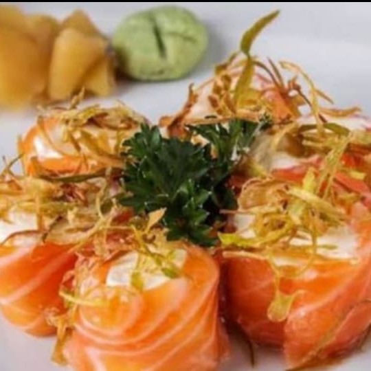 Arroz , salmão fresco, cream chesse , palha de alho poró