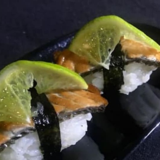 2 unidades . Arroz japonês , lâmina de salmão maçaricado.