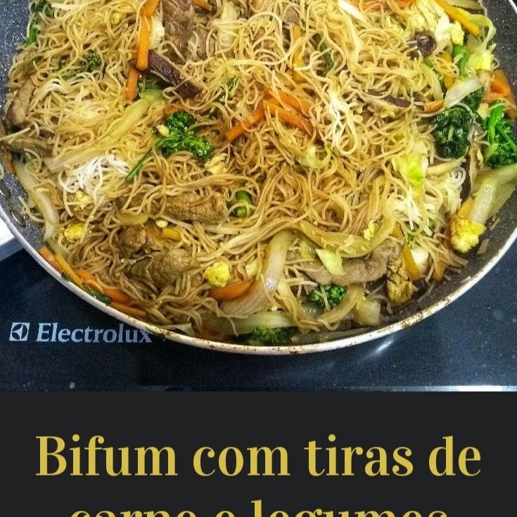 Macarrão de arooz, cenoura, repolho, cebola, carne
