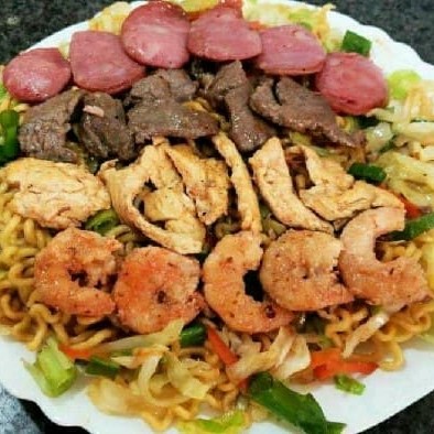 Macarrão, cenoura, repolho, cebola, carne, calabresa, camarão, frango