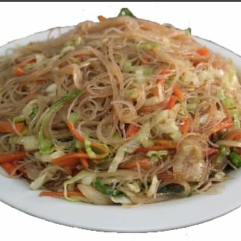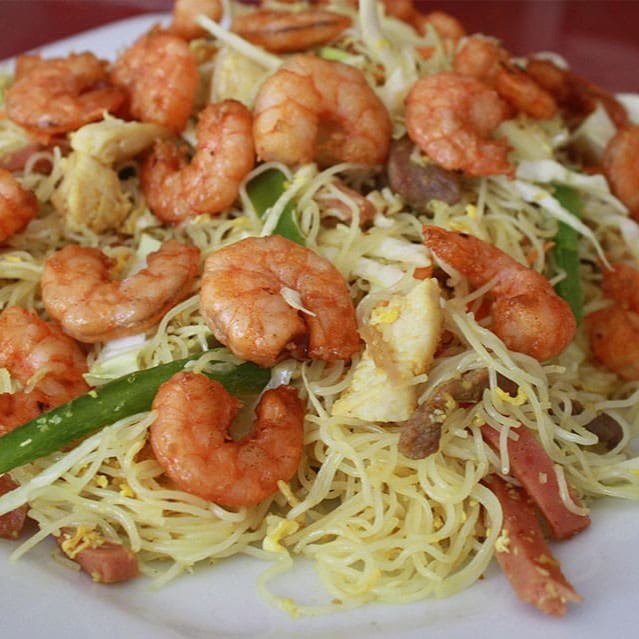 Macarrão de arroz, camarão sem casca, repolho, cenoura e cebola.