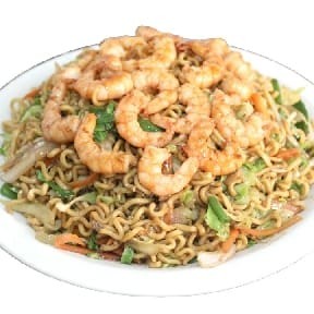Macarrão/molho shoyu/repolho/cebola/cenoura/camarão