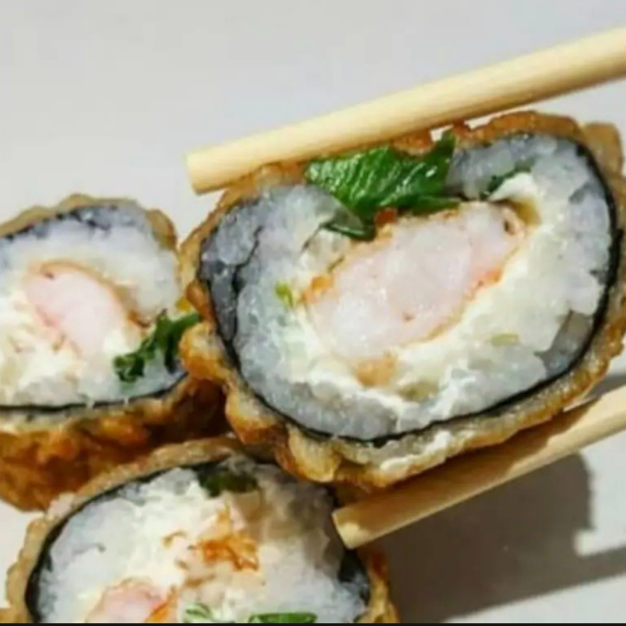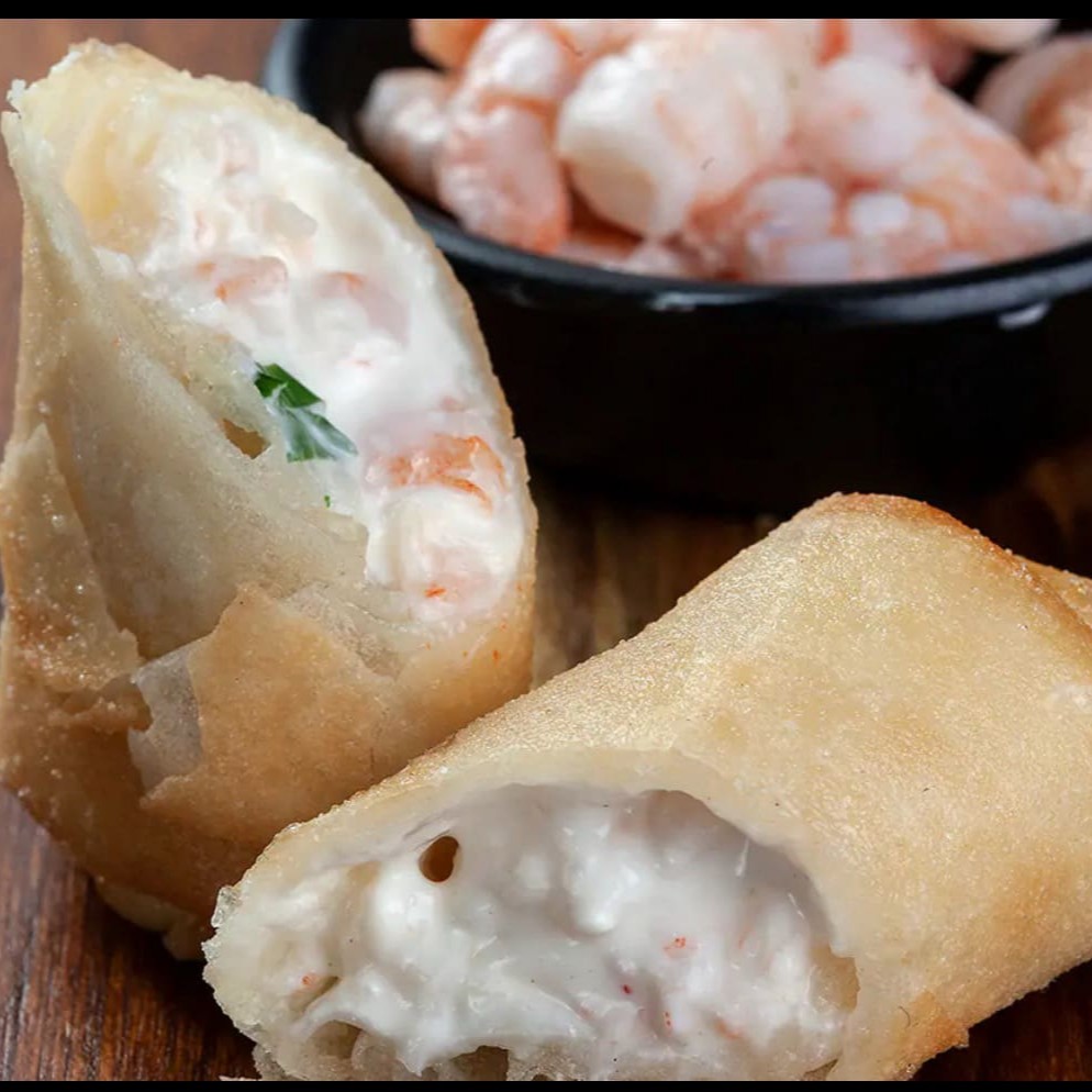 Massa de harumaki frito com recheio de camarão e cream cheese.
