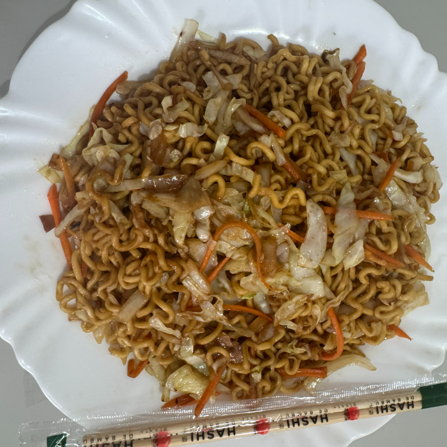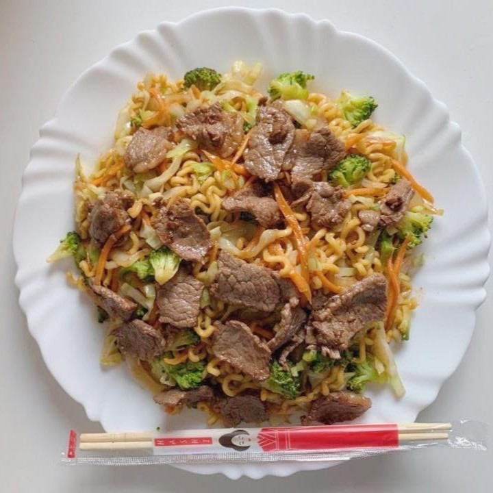 O melhor yakisoba de carne: Macarrão, carne, cebola, cenoura e repolho.