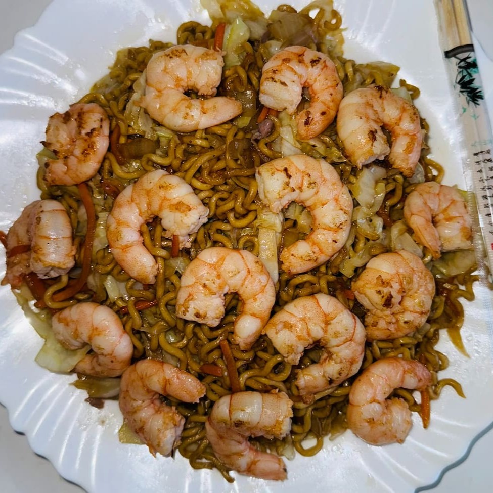 O melhor yakisoba de camarão: Macarrão, camarão, cebola, cenoura e repolho.