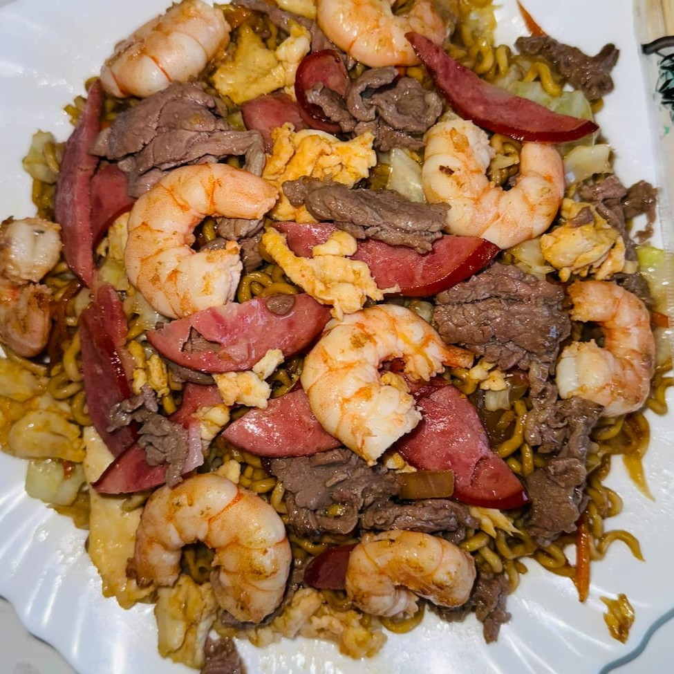 Macarrão, camarão, carne, frango, calabresa, bacon, cebola, cenoura e repolho