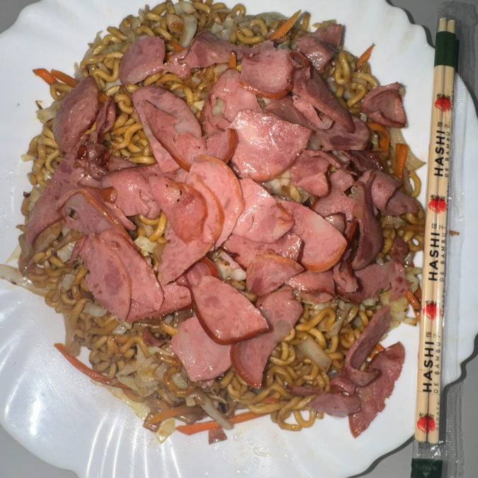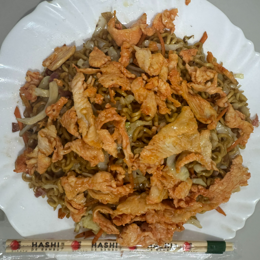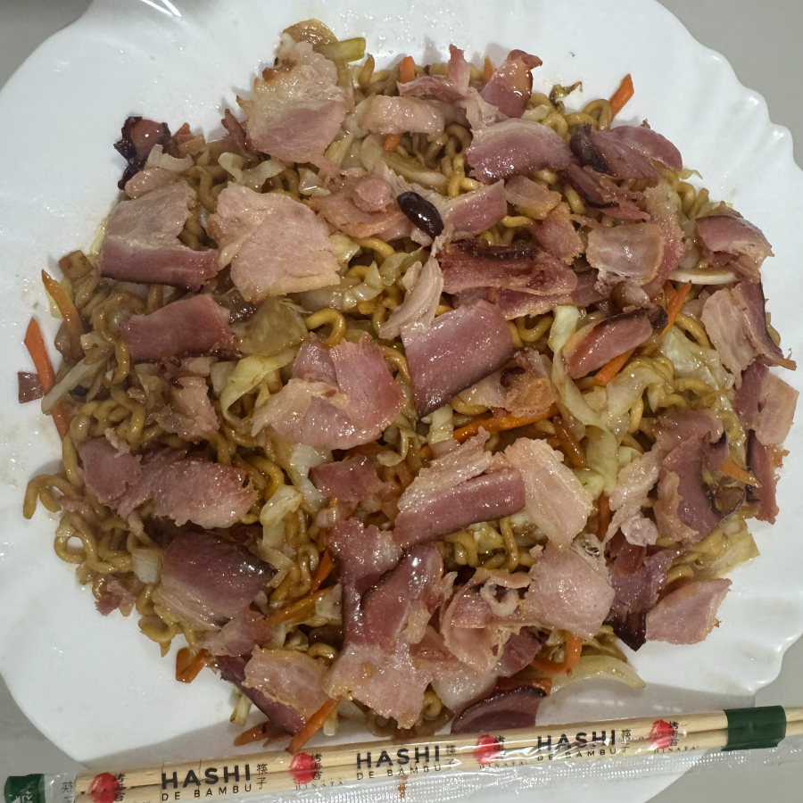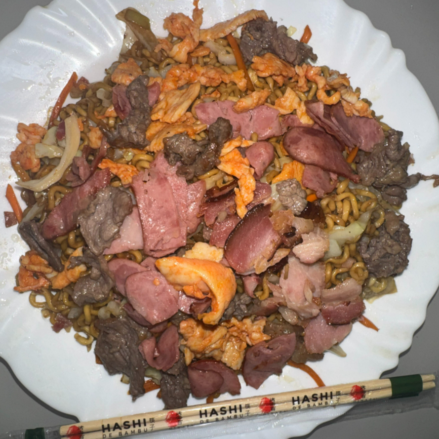 O melhor yakisoba : frango, carne, calabresa, bacon, cebola, cenoura e repolho.