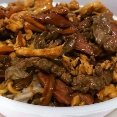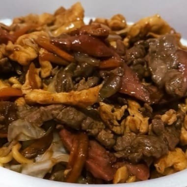 Acompanhado de: macarrão, frango, carne, calabresa, repolho, cenoura, cebola e nosso delicioso molho shoyu da casa.