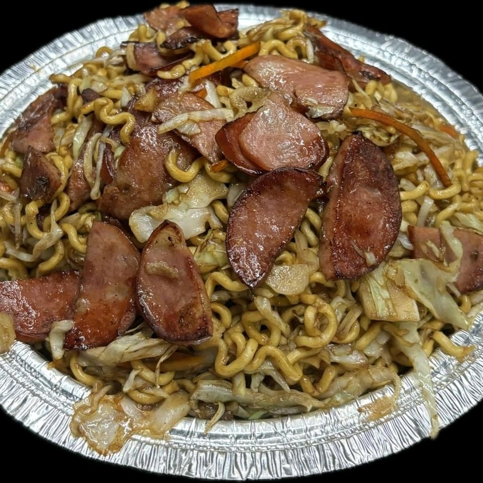 Calabresa, molho shoyu, repolho, cenoura, ajinomoto e macarrão.