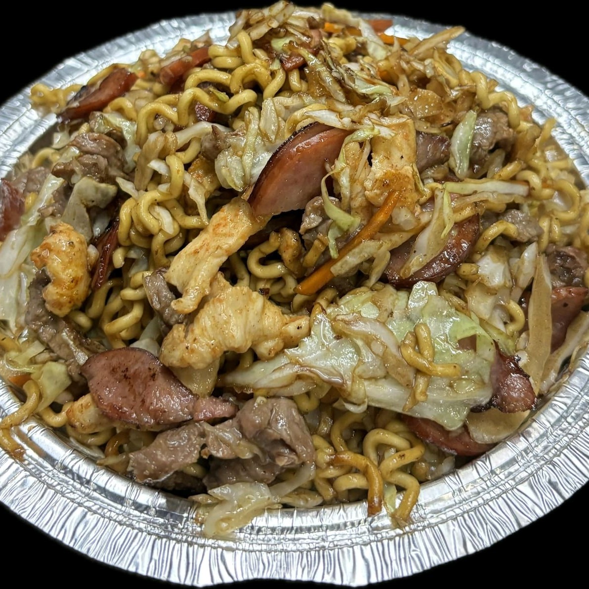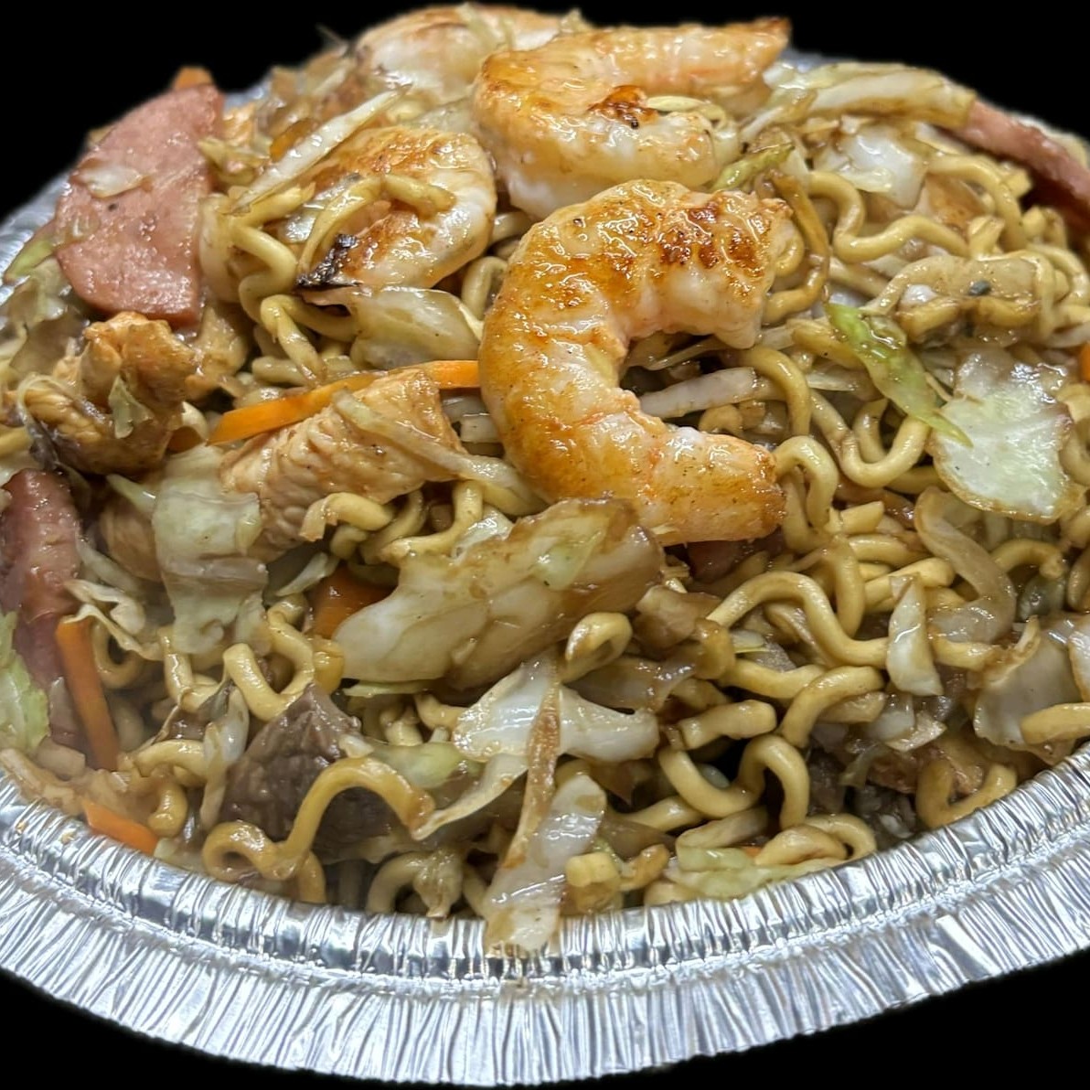 Frango, Carne, Calabresa, Camarão, molho shoyu, repolho cenoura, ajinomoto e macarrão.