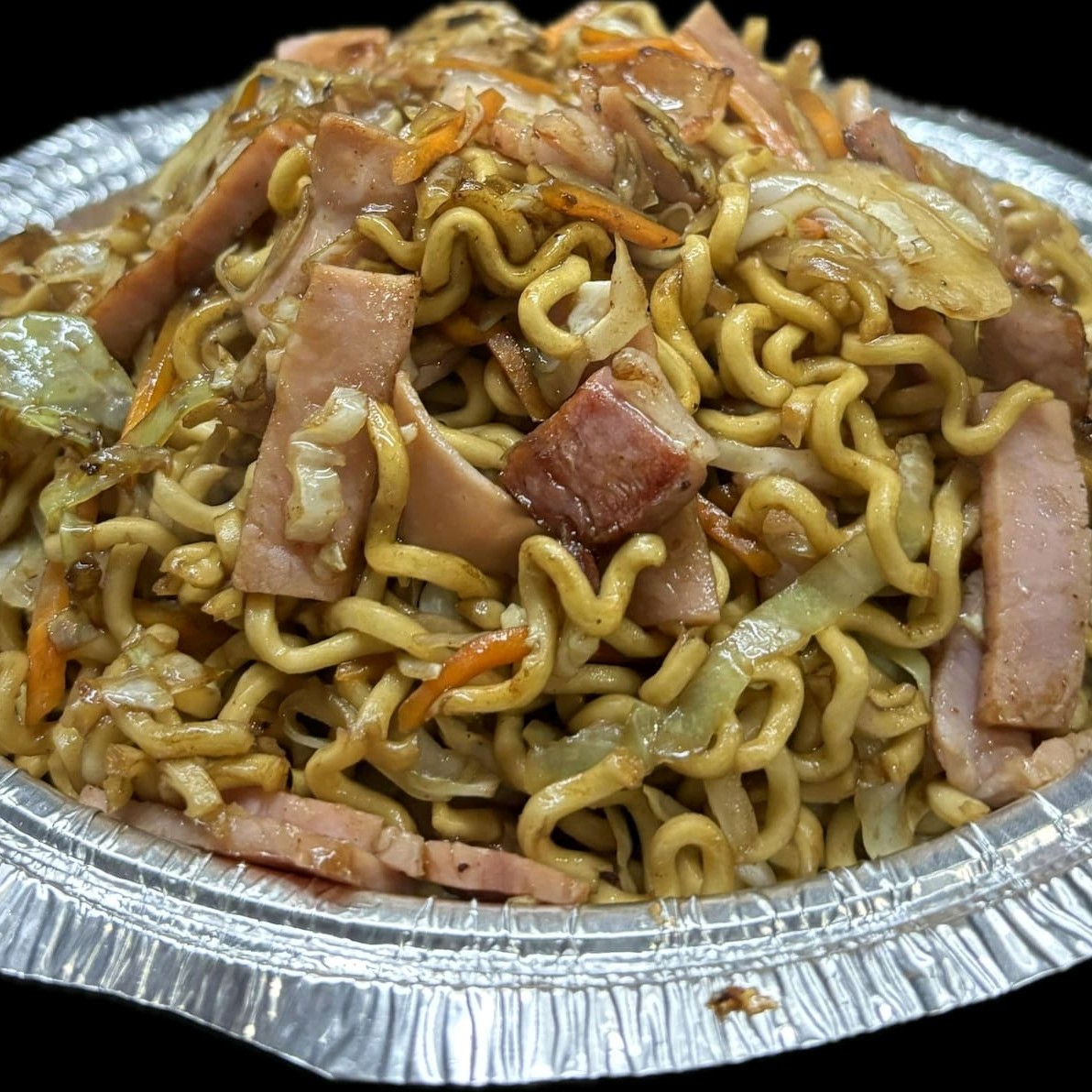 Bacon, Presunto, molho shoyu, repolho cenoura, ajinomoto e macarrão.