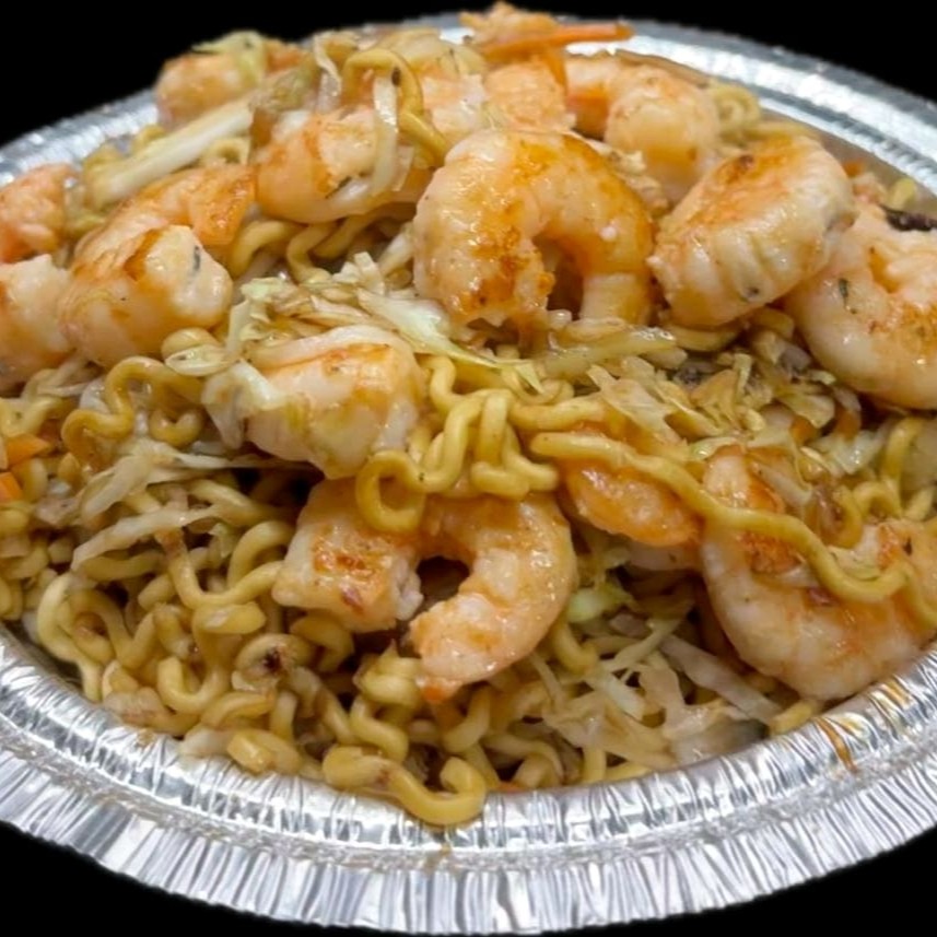 Camarão, molho shoyu, repolho cenoura, ajinomoto e macarrão.