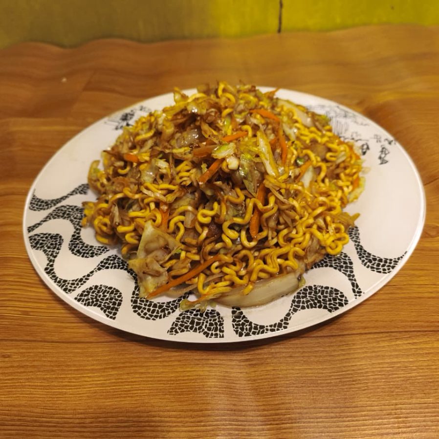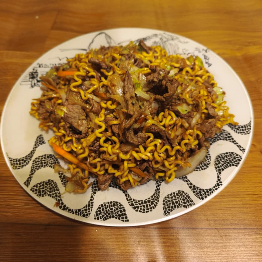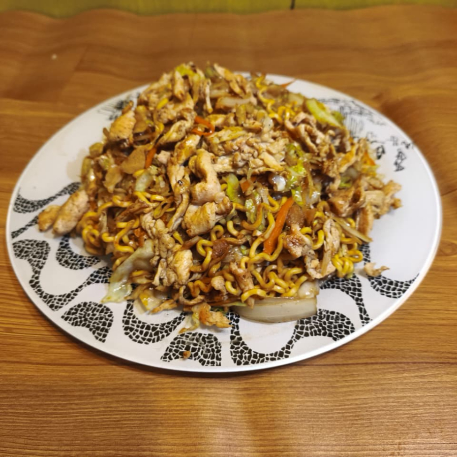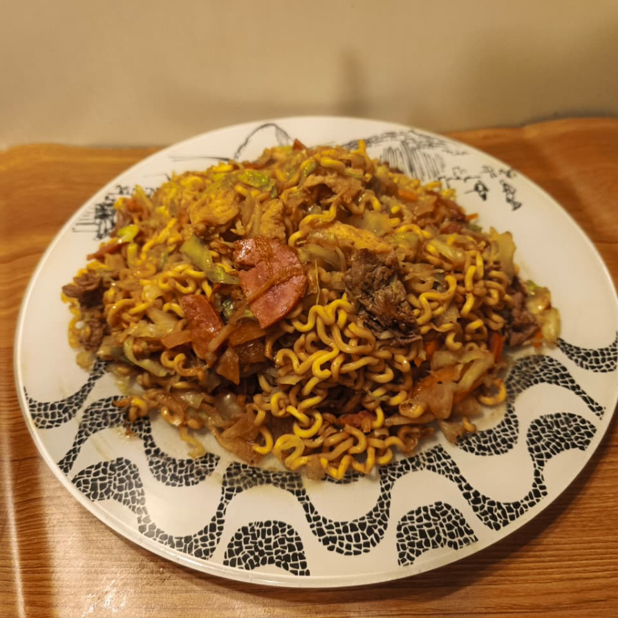 Macarrão, carne, frango, calabresa, cenoura, repolho, cebola e shoyu.
