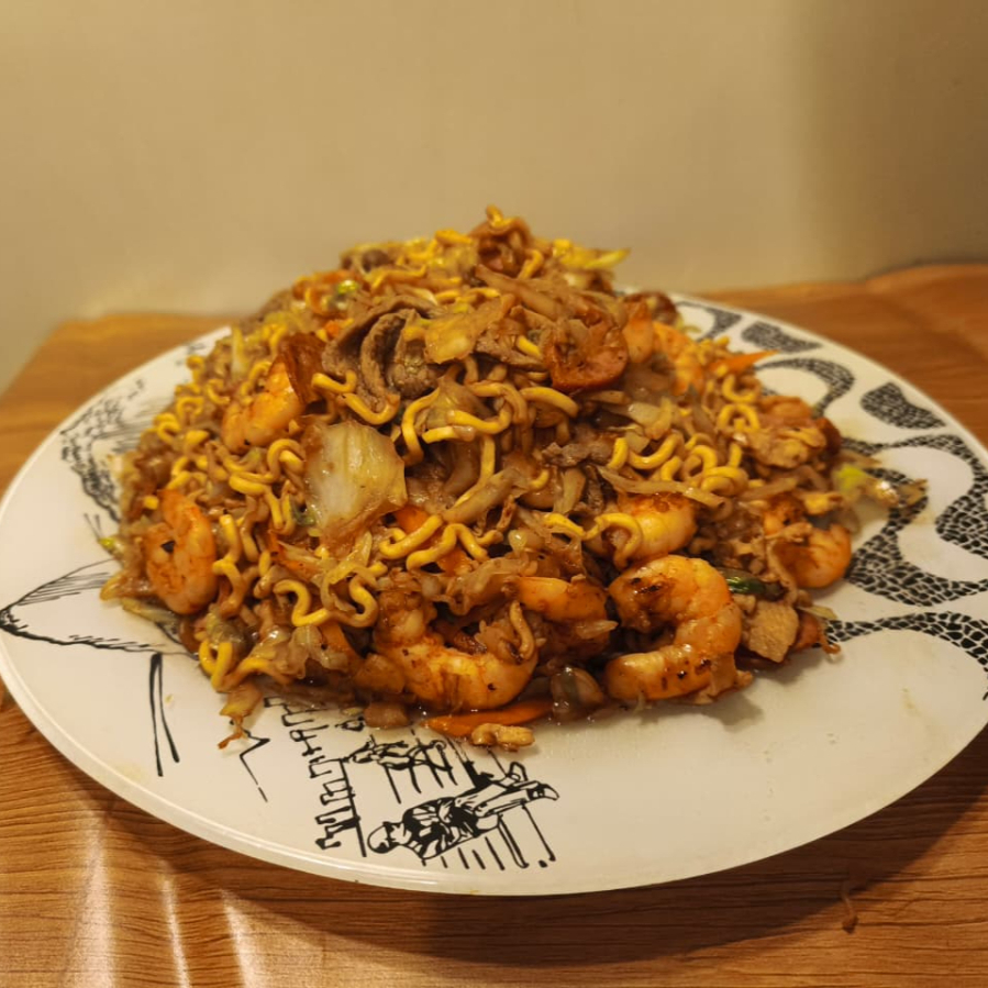Macarrão, carne, frango, calabresa, camarão, cenoura, repolho, cebola e shoyu.