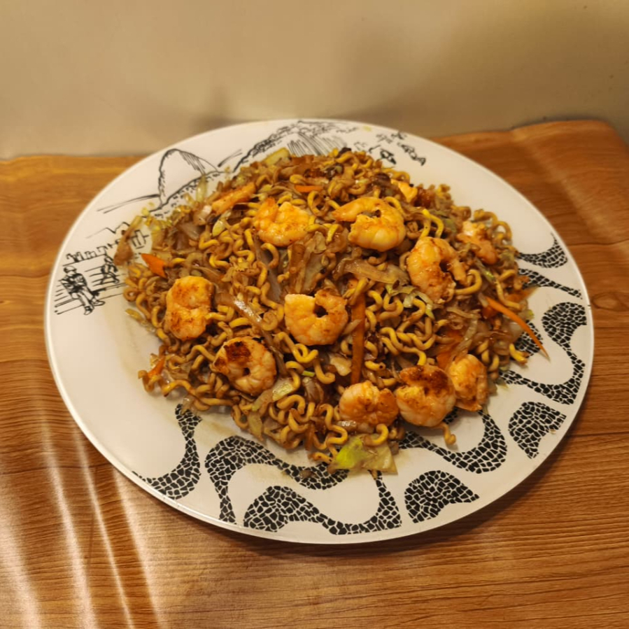Macarrão, camarão, cenoura, repolho, cebola e shoyu.
