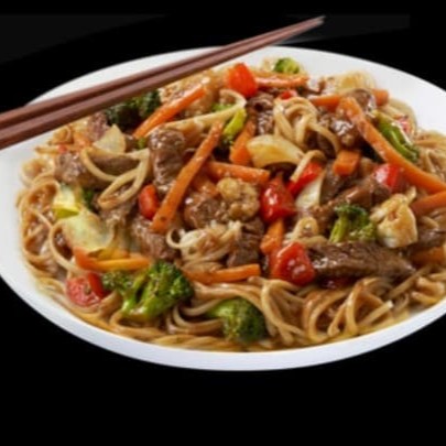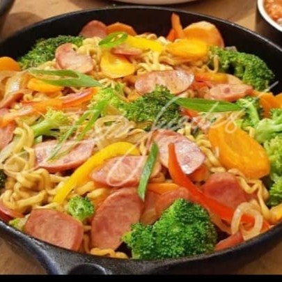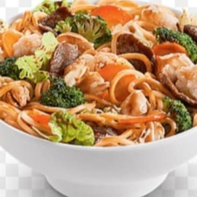 Carne, frango, calabresa, camarão, repolho, cenoura, cebola, molho shoyu e tempero chinês. Macarrao.