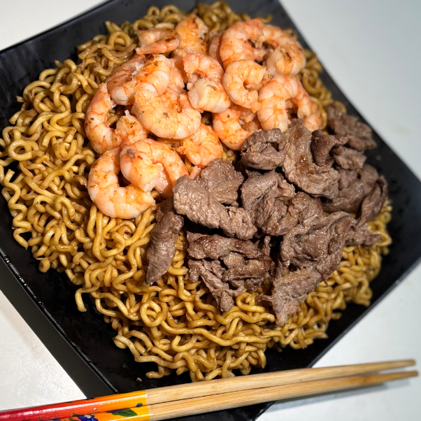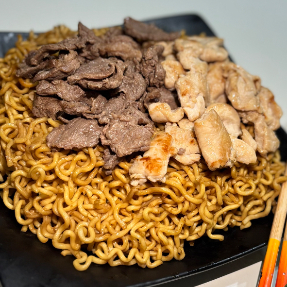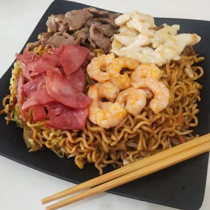 Preparamos um delicioso yakisoba misto com : Brócolis, cebola, Cenoura, repolho verde, Linguiça calabresa, Camarão, Carne, Frango e nosso shoyu especial.