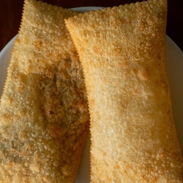 9 camarões descascados e 1 fatia de mussarela. Obs: Nosso pastel tem um tamanho semelhante ao pastel de feira.