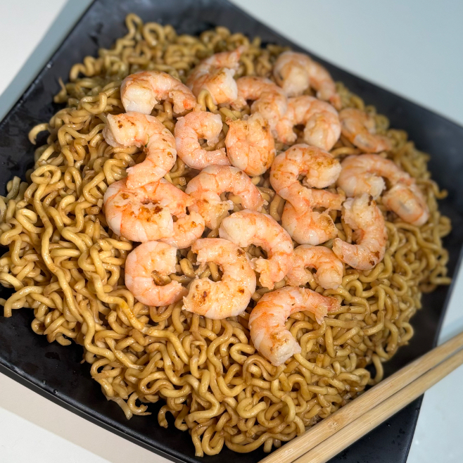 Preparamos um delicioso yakisoba de Camarão com : Brócolis, Cebola, Cenoura, Repolho Verde, e nosso shoyu especial