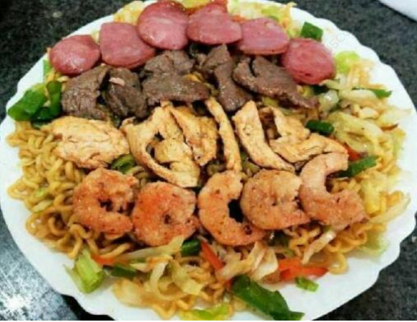 Macarrão, repolho, cenoura, cebola, carne, frango, calabresa e camarão.