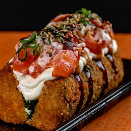 Arroz empanado, com recheio de salmão, cream cheese finalizado com cebolinha, Teriaki e gergelim