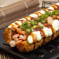 Arroz empanado, recheado com camarão e cream cheese, finalizado com teriaki, cebolinha e gergelim