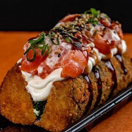 Arroz empanado com recheio de salmão, cream cheese finalizado com cebolinha Teriaki e gergelim