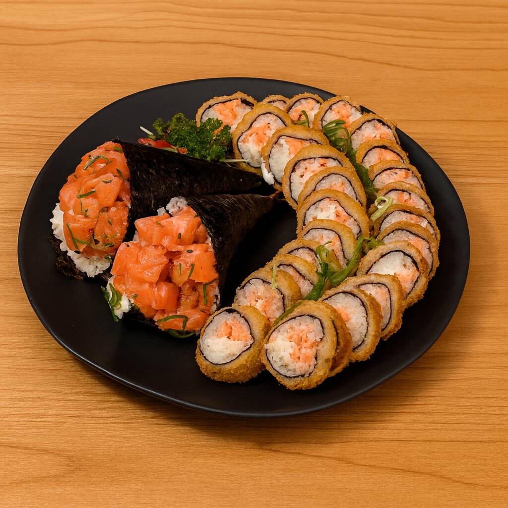5 Sashimis salmão 4 Joys salmão 5 Sushis Salmão 5 Uramakis skin ao tarê 5 Uramakis filadélfia 12 Hots filadélfia 2 Harumakis camarão com Catupiry