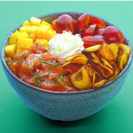 Nosso suculento poke com arroz, peças de hot filadélfia, manga, crispy de alho poró, cebolinha, cubos de salmão e gergelim.