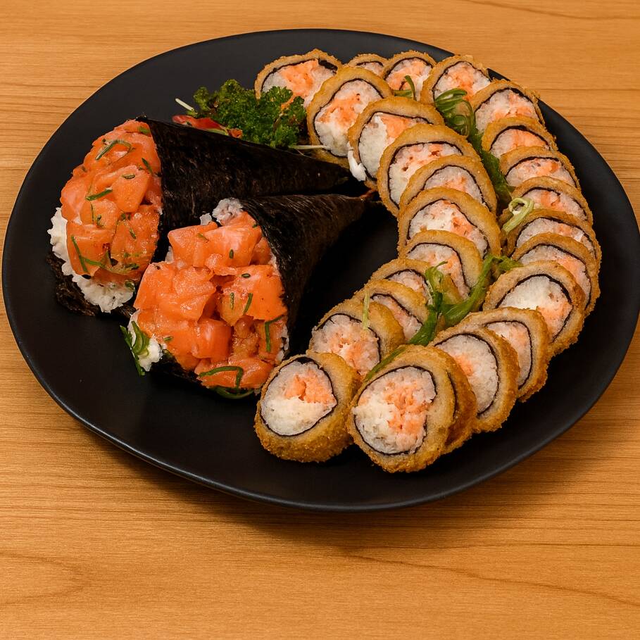 5 Sashimis salmão 4 Joys salmão 5 Sushis Salmão 5 Uramakis skin ao tarê 5 Uramakis filadélfia 12 Hots filadélfia 2 Harumakis camarão com Catupiry
