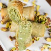 Essa perfeição de sobremesa veio para ficar! São 06 fatias de banana empanadas cobertas com muito recheio de pistache e finalizadas com castanha de caju em pedaços.