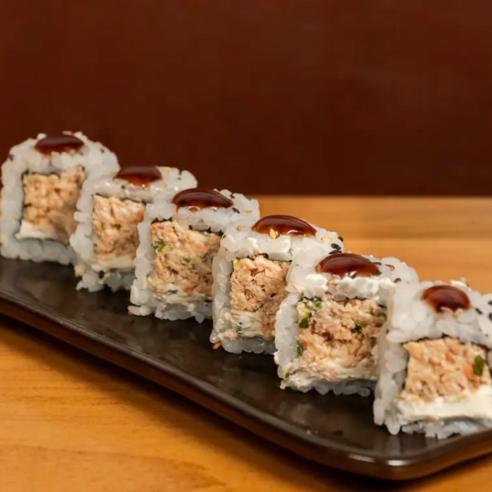 Arroz empanado, recheado com salmão, cream cheese finalizado com cebolinha, teriaki e gergelim