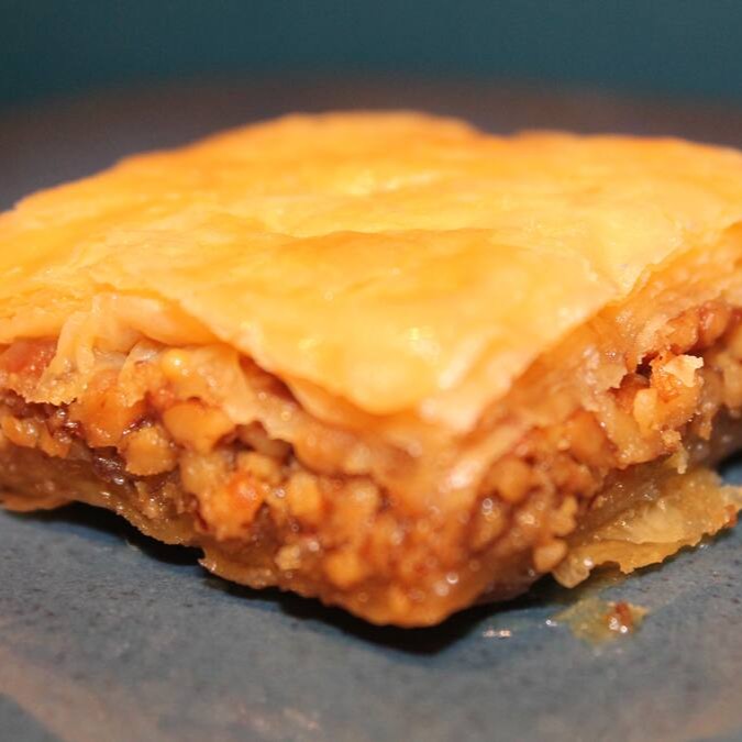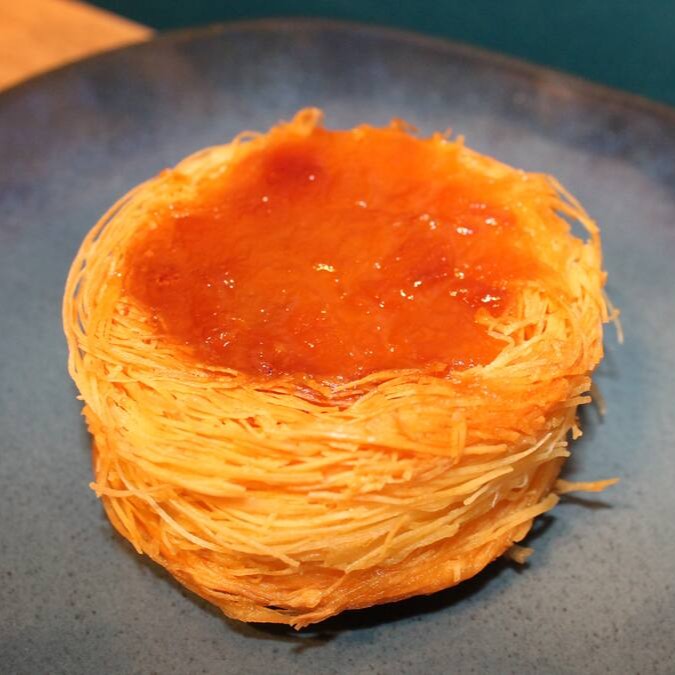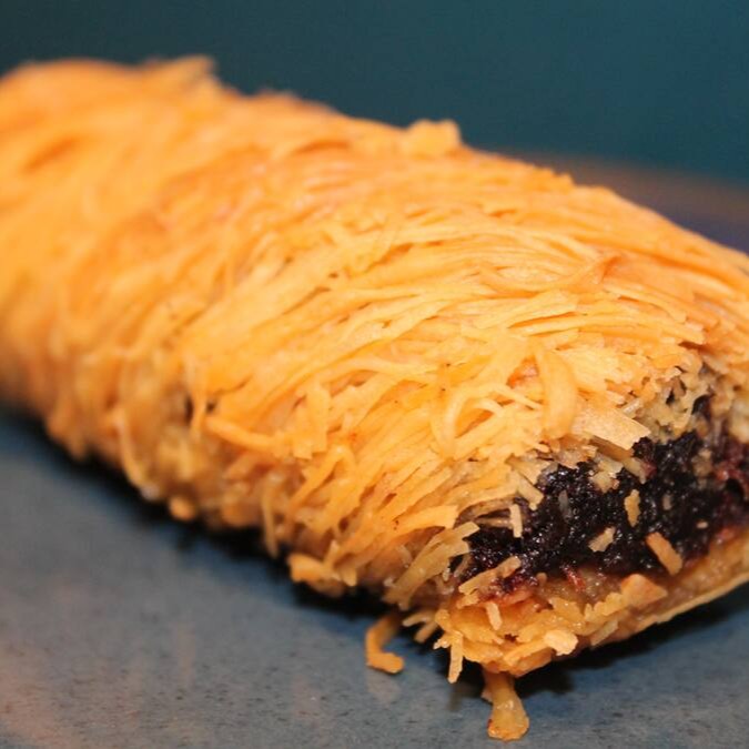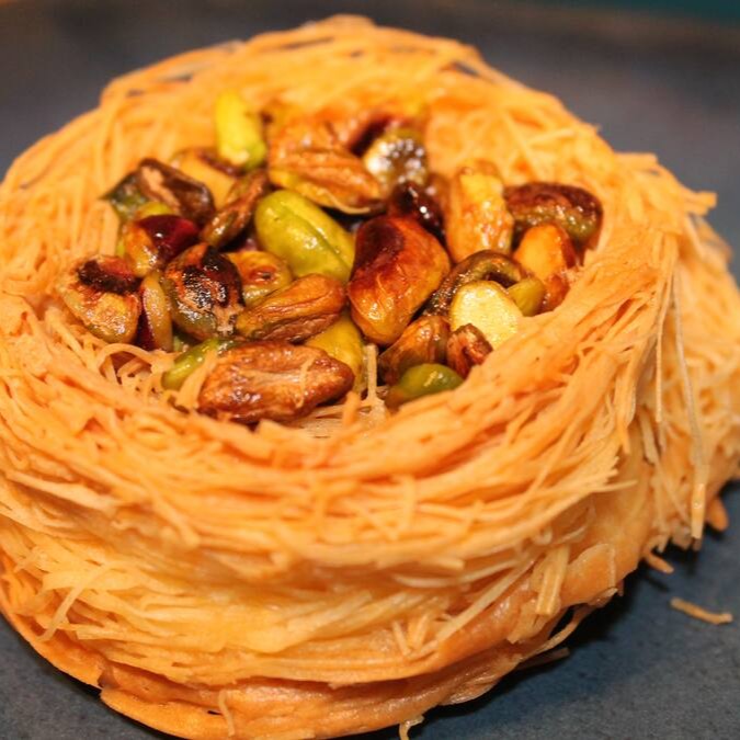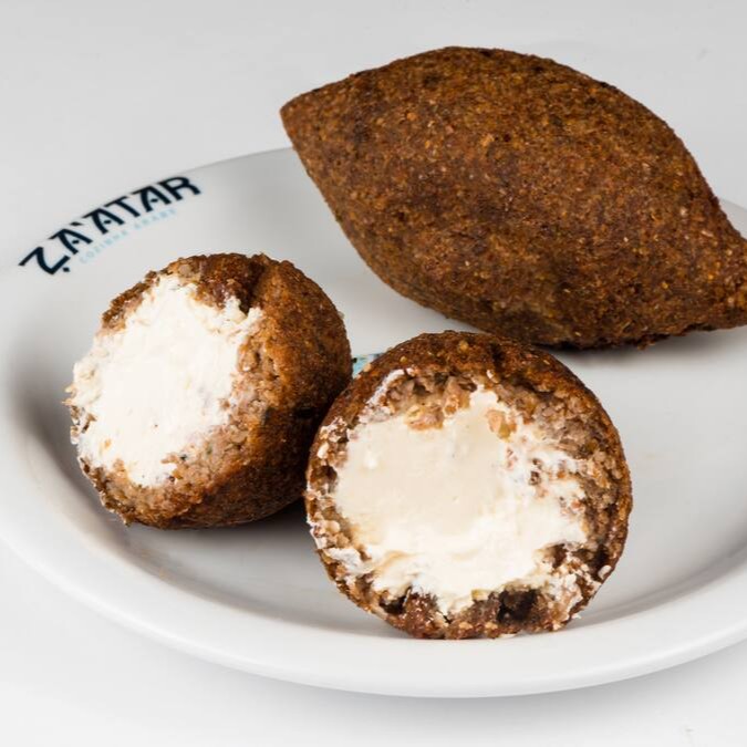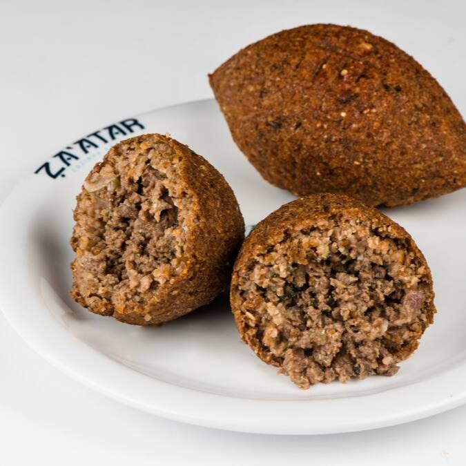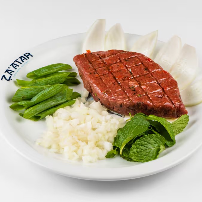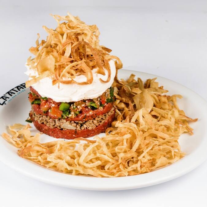 Camadas intercaladas de kibe cru, tabule e carne refogada, finalizada com coalhada seca e cebolas crocantes.