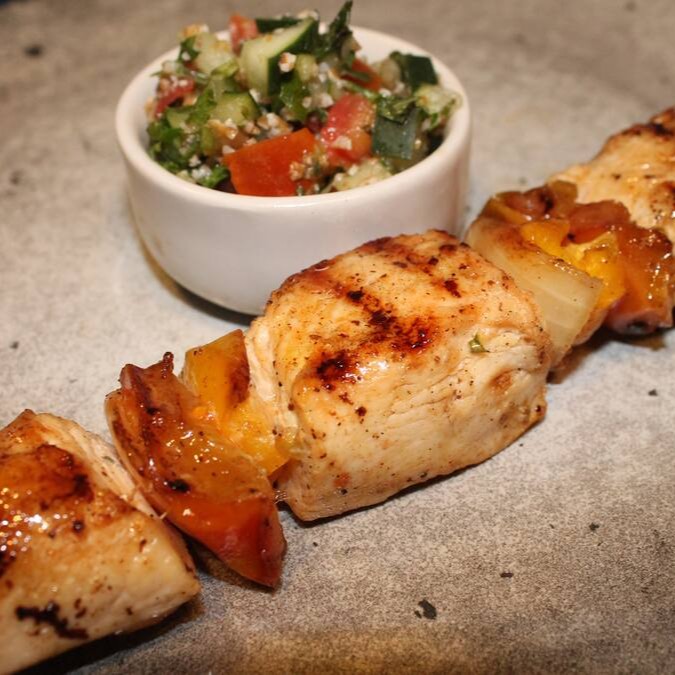 1 unidade de kafta de peito de frango moído 120g aproximadamente, grelhada e temperada a nossa moda. Acompanha 1 pote com 20g. aproximadamente de salada de tabule.