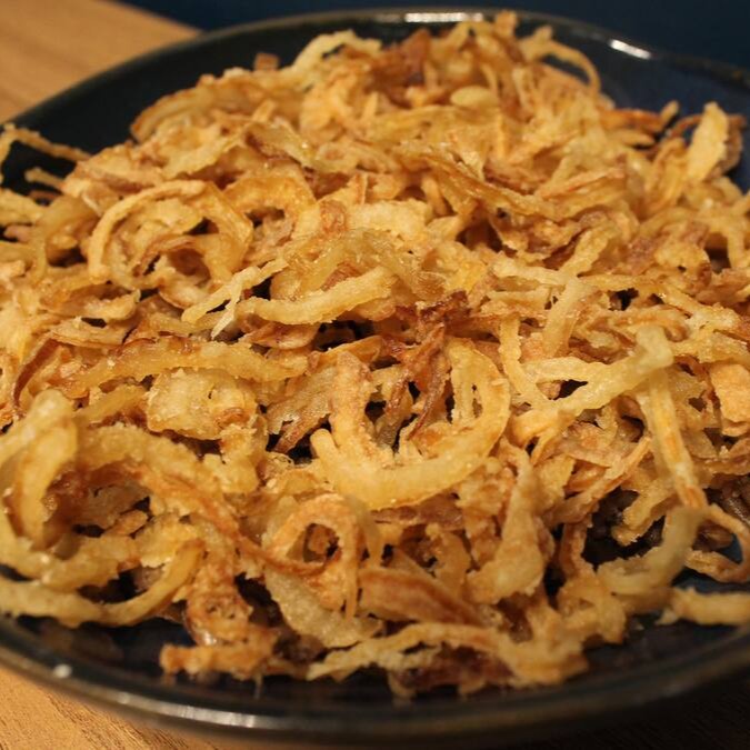 Finas tiras de cebolas fritas à moda árabe. Acompanha bem todos os pratos.